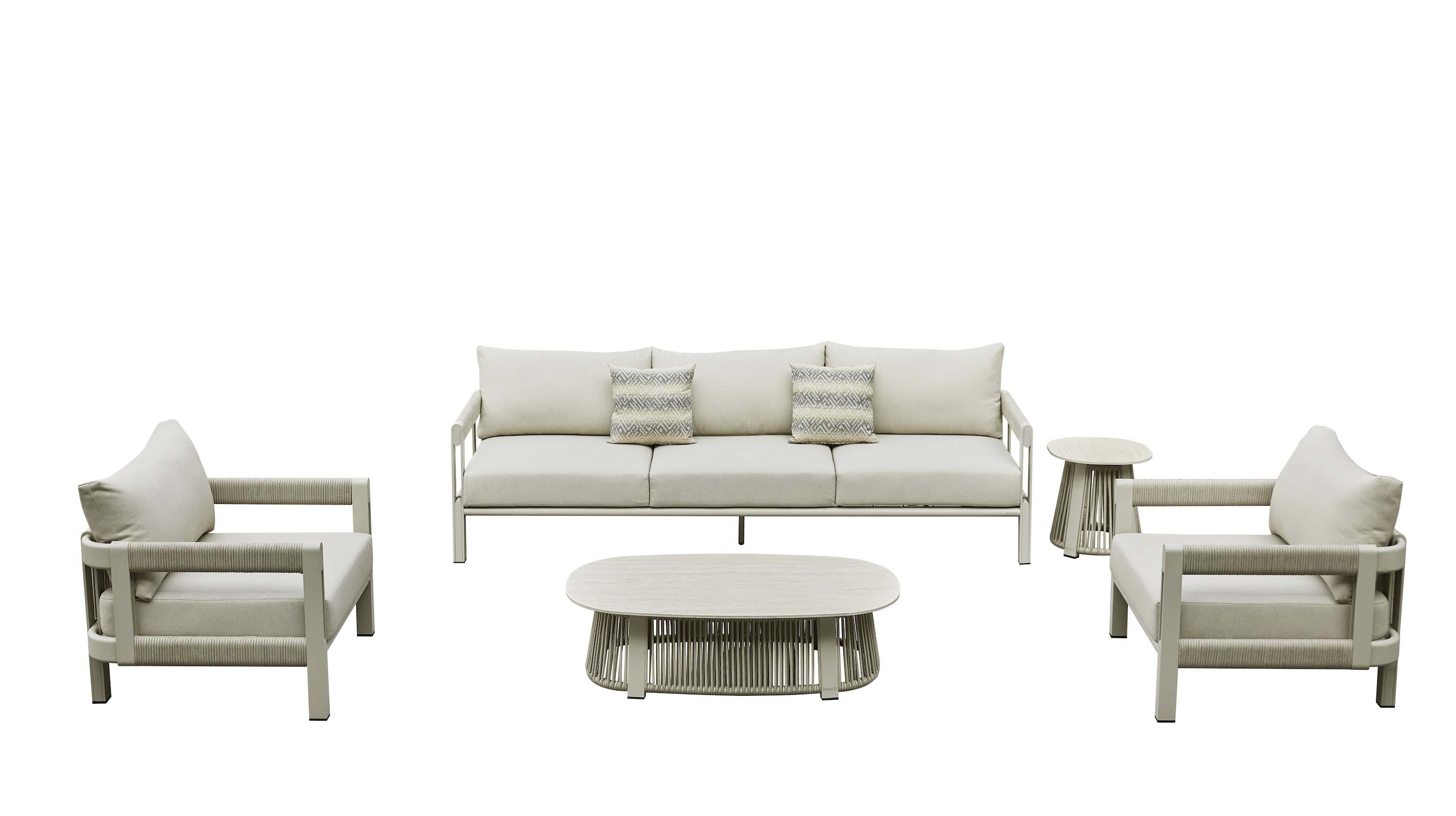 Conçu en aluminium robuste avec détails en corde tressée, cet ensemble outdoor comprend un canapé 3 places, deux fauteuils, une table basse et une table d’appoint. Les deux tables basses assorties sont dotées de plateaux en céramique, un matériau à la fois raffiné, résistant aux rayures et facile à entretenir, parfait pour un usage extérieur.